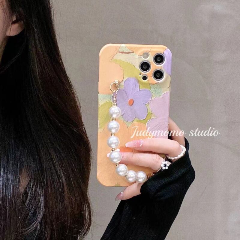 ins風黄色油絵花に適したiphone12パールチェーン携帯電話シェルxsマックスアップル11proソフトxr 真珠 フラワーデザイン かわいい MOMO87763509998