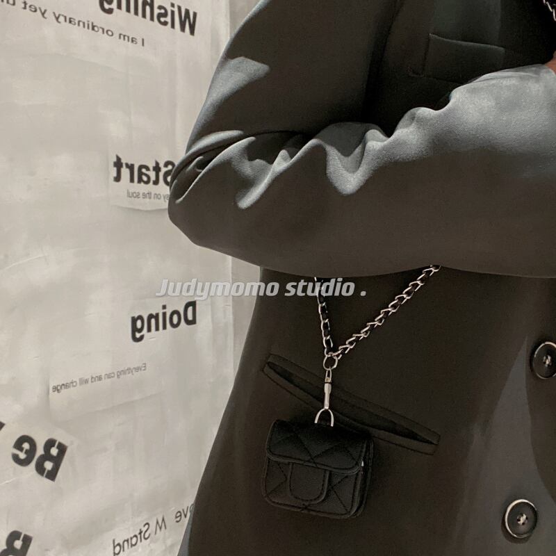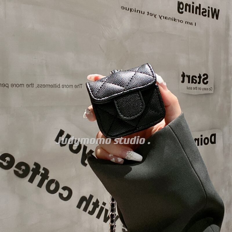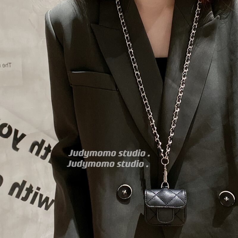 TemperamentLinggeブラックレザースモールバッグチェーンハンギングネックイヤホンスリーブエアポッドAppleBluetoothイヤホンシェル ブルー かわいい MOMO41197538377