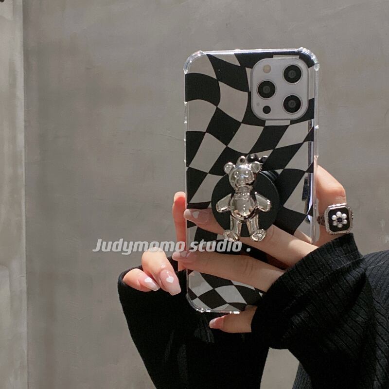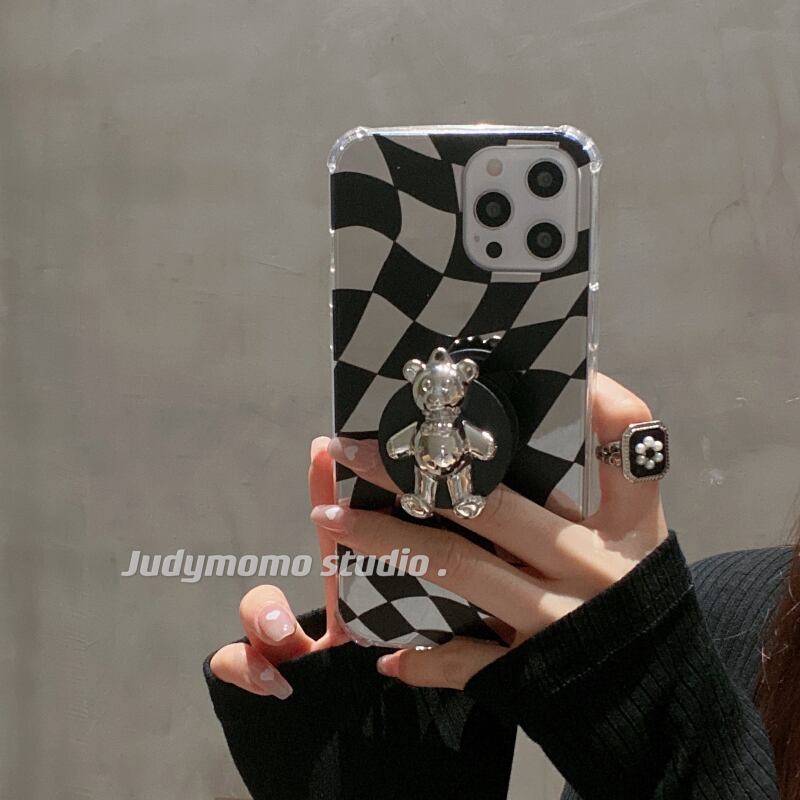 黒と白の格子三次元シルバーベアスタンドiPhone11Apple 12promax携帯電話ケース8pアンチドロップx ホワイト ブラック 銀 かわいい MOMO90588824730