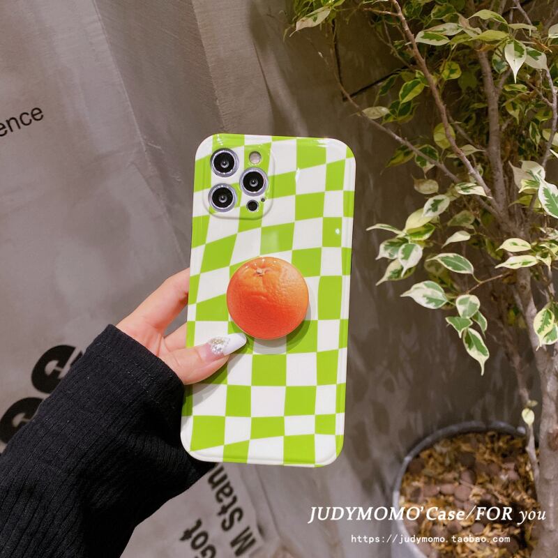insニッチチェッカーボードラティスグリーンiPhone11アップル12proマックスオレンジブラケット携帯電話シェルxr かわいい MOMO24526410795