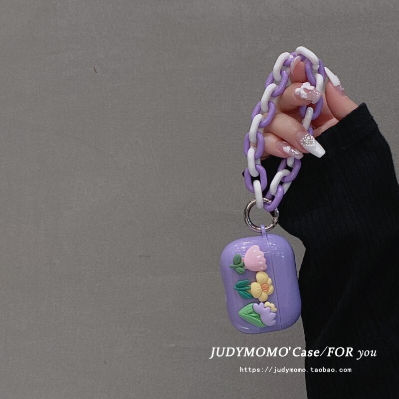 自家製のかわいい紫色の花の花のチェーンイヤホンカバー適切なairpodsプロアップルBluetoothイヤホン保護カバー ブルー 大人ガーリー スウィート キュート カジュアル フラワーデザイン パープル かわいい MOMO49639860424