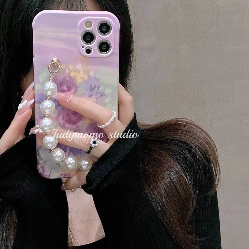 ins風油絵パープルフラワーパールチェーンに適したiphone11promaxアップル12シリコンxsソフト8pメスxr7 真珠 フラワーデザイン かわいい MOMO31310757615