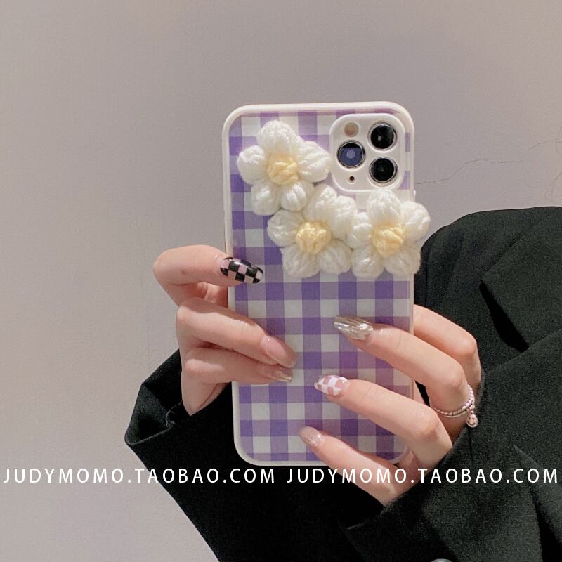 ガーリーチェック柄パープルぬいぐるみ花iPhonexApple 12promax携帯電話ケース11proソフトxr7 フラワーデザイン iphoneケース かわいい MOMO48503812084