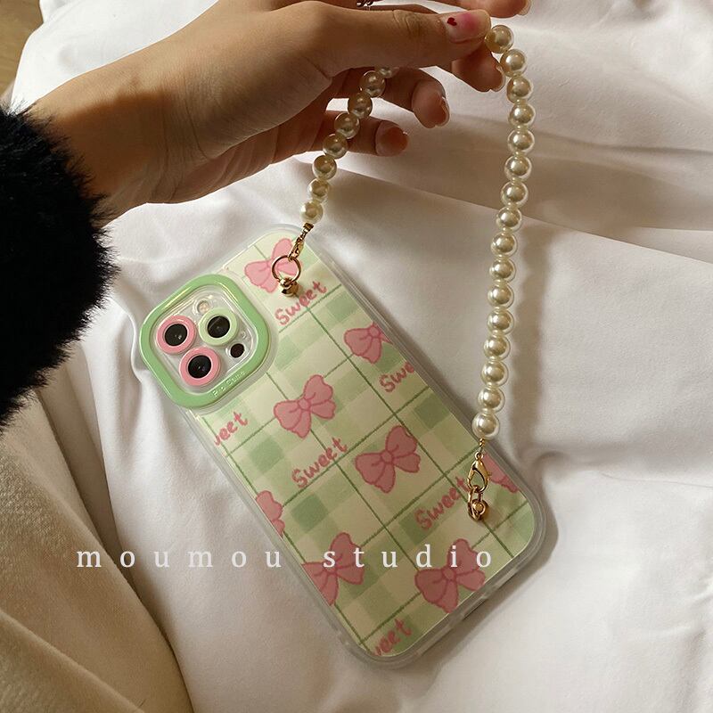 と韓国の弓真珠チェーンに適した携帯電話シェル12promaxシリコンスリーブxメス リボン パール かわいいA MOMO_A26847668129